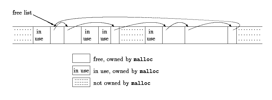 Rather than allocating from a compiled-in fixed-size array, malloc will request space from the operating system as needed. Since other activities in the program may also request space without calling this allocator, the space that malloc manages may not be contiguous. Thus its free storage is kept as a list of free blocks. Each block contains a size, a pointer to the next block, and the space itself. The blocks are kept in order of increasing storage address, and the last block (highest address) points to the first.
