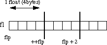 Fig. 9.2 Pointer Arithmetic Assume that flp points to fl then if we increment the pointer ( ++flp) it moves to the position shown 4 bytes on. If on the other hand we added 2 to the pointer then it moves 2 float positions i.e 8 bytes as shown in the Figure.