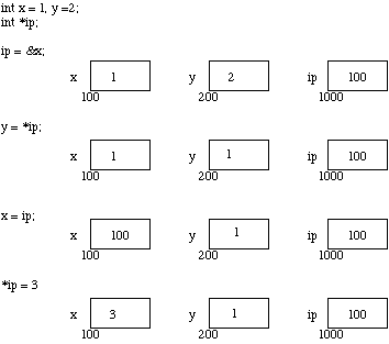 Fig. 9.1 Pointer, Variables and Memory Now the assignments x = 1 and y = 2 obviously load these values into the variables. ip is declared to be a pointer to an integer and is assigned to the address of x (&x). So ip gets loaded with the value 100.