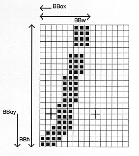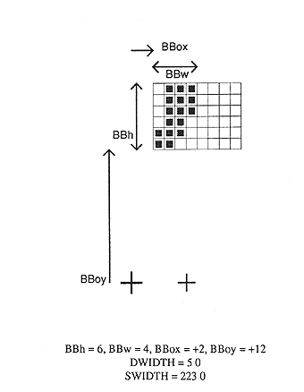 - The word BBX followed by the width in x (BBw), height in y (BBh) and x and y displacement (BBox, BBoy) of the lower left corner from the origin of the character.